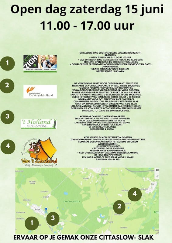 Inspiratie-locatie Doorzicht, Doeboerderij De Vergulde Hand, Minicamping ’t Hofland en Van ’t Zandeind openen deze dag hun deuren voor verschillende gezellige activiteiten. Luisteren naar live optredens, genieten van exposities en het brocante marktje, of een lekker kopje koffie drinken na een wandeltocht: er is meer dan genoeg te beleven. Kom langs en ervaar de echte Cittaslow-beleving bij een van deze toplocaties!