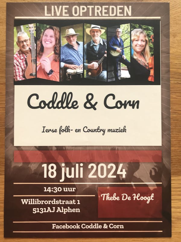 Op donderdagmiddag 18 juli van 14:30 uur tot ongeveer 16:15 uur is er bij De Hoogt een liveoptreden van Coddle & Corn. Zij spelen Ierse Folk- en Countrymuziek. Het adres is: Willibrordstraat 1 te Alphen.