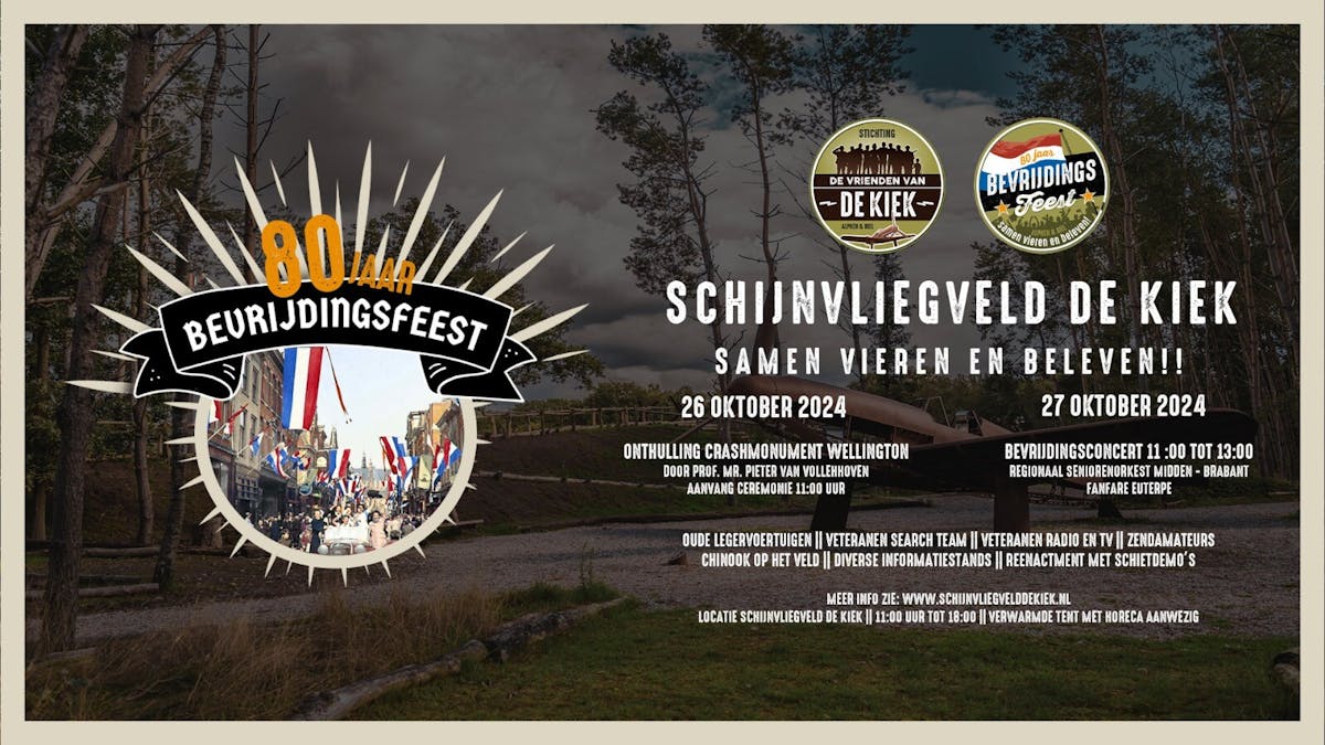 In het kader van de viering van 80 jaar bevrijding organiseert Stichting de Vrienden van de Kiek een tweedaags bevrijdingsfeest bij Schijnvliegveld de Kiek in het weekend van 26 en 27 oktober. Tijdens dit weekend zijn er allerlei activiteiten voor jong en oud te beleven. Zo komen er reenacters de oorlog naspelen met demonstraties, zijn er oude voertuigen, staat er een chinook op het veld en is er een informatiemarkt met tentoonstelling in samenwerking met diverse verenigingen en musea. Een bijzonder onderdeel is het bevrijdingskoffieconcert dat op zondagochtend 27 oktober wordt georganiseerd. Het Regionaal Seniorenorkest Midden-Brabant en fanfare Euterpe zullen muziek spelen uit de periode rond de Tweede Wereldoorlog. Voor velen zullen het herkenbare nummers zijn.