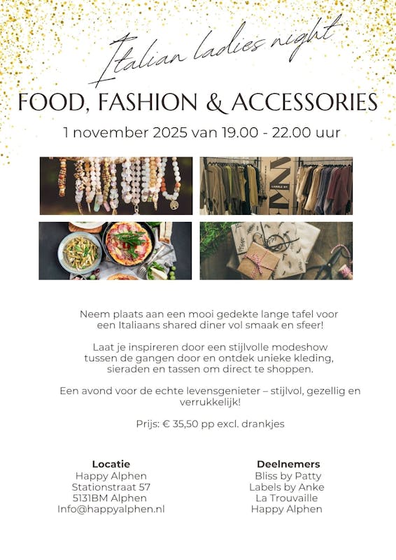 Shop meteen je favoriete outfit, tas of sieraad en geniet van een avond vol sfeer, stijl en Italiaanse gezelligheid