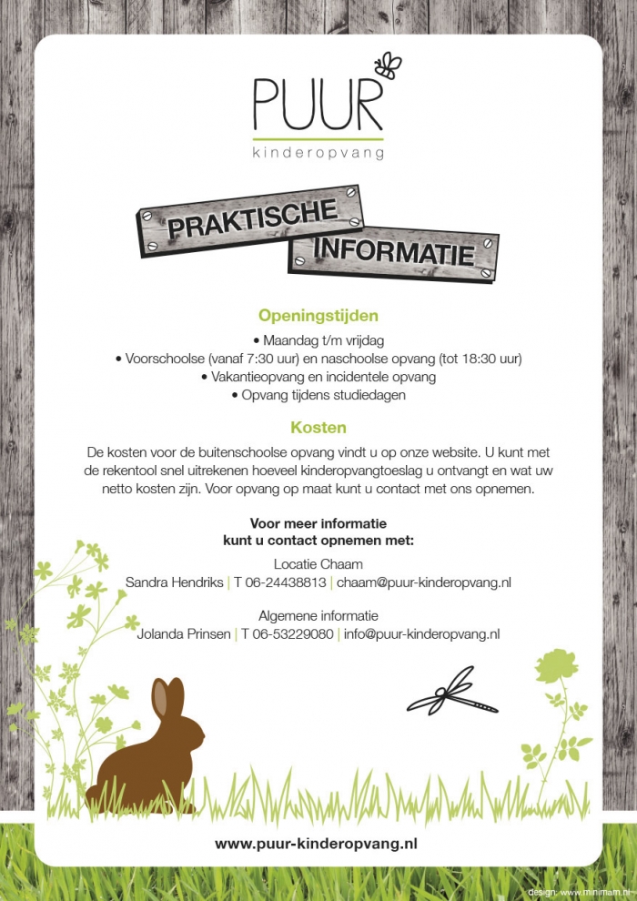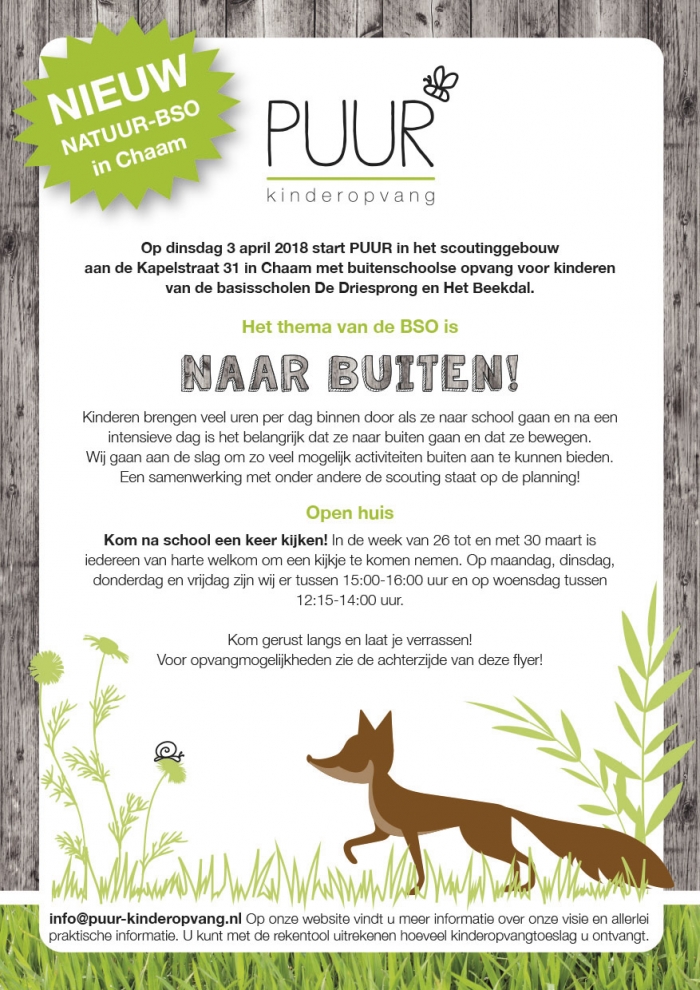 Op dinsdag 3 april 2018 start PUUR Kinderopvang in het scoutinggebouw aan de Kapelstraat 31 te Chaam met een buitenschoolseopvang voor kinderen van de basisschool De Driesprong en Het Beekdal