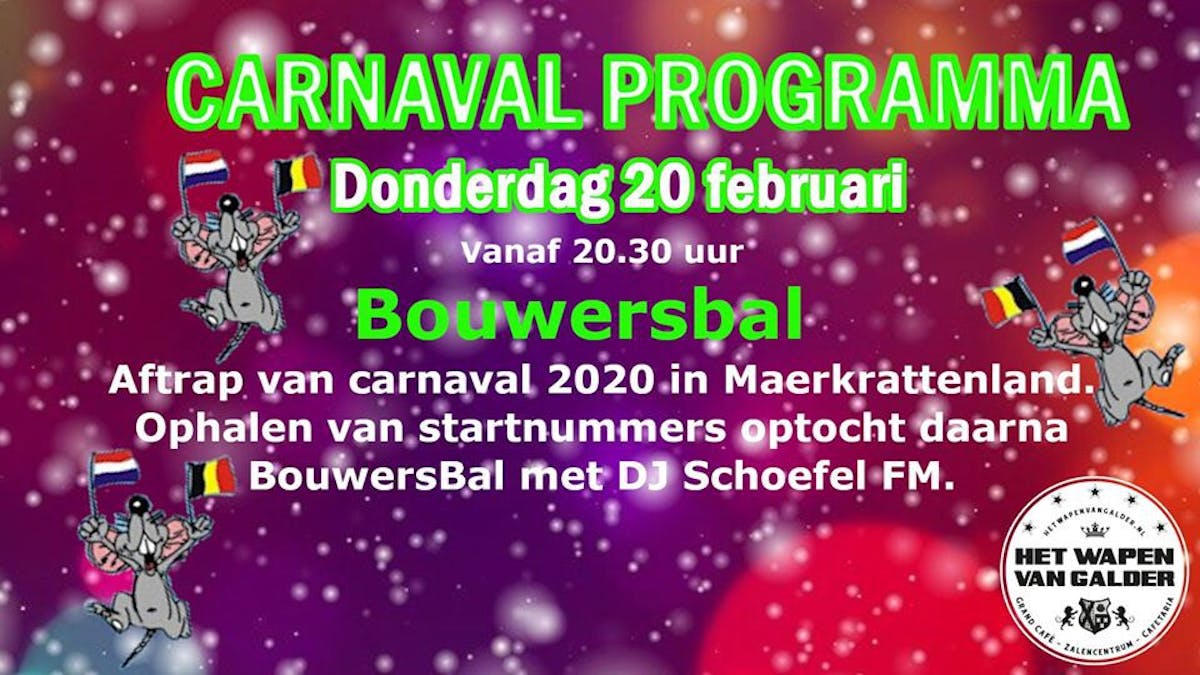 Bouwersbal met o.a. DJ Schoefel f.m. Tevens uitreiking nummers voor de optocht. Cafetaria is geopend voor een lekker frietje en een snack.