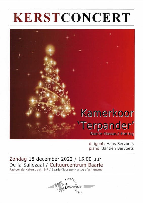 Op zondag 18 december a.s. verzorgt Kamerkoor Terpander een Kerstconcert in De La Salle Zaal van het Cultuurcentrum Baarle. Het koor zingt bekende en minder bekende kerstliederen. In het Nederlands, Latijns, Engels en zelfs in het Zweeds.