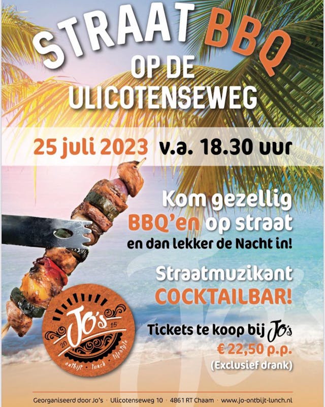 Over iets minder dan een week is het dan zover… een te gekke straatbarbeque aan de ulicotenseweg. We hebben al vele kaartjes verkocht, wil jij er ook bij zijn kom dan zeker nog een ticket halen bij Jo’s.