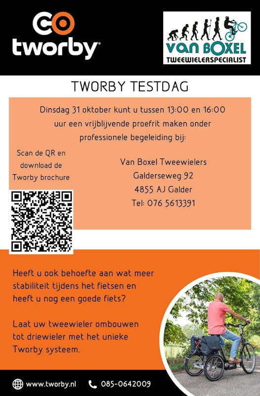 Bij van Boxel Tweewielers heeft men veel ervaring met aangepast fietsen, zij zijn verkooppunt van Tworby. Een Tworby maakt het mogelijk om van vrijwel elke tweewieler een stabiele driewieler te maken. Op dinsdag 31 oktober wordt er bij van Boxel Tweewielers van 13:00 - 16:00 uur een Tworby Testdag georganiseerd. Locatie: Galderseweg 92, 4855 AJ Galder. Aanmelden voor de driewieldag is niet nodig, voor koffie en thee wordt gezorgd.