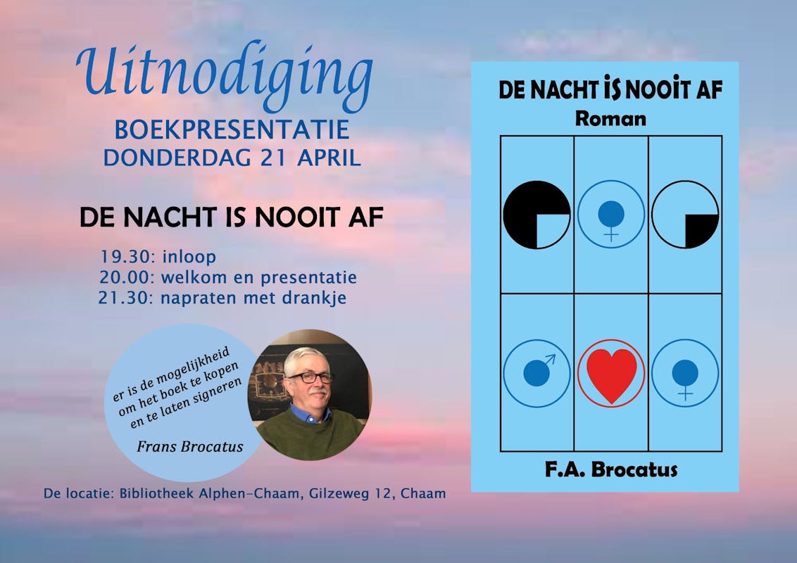 Donderdag 21 april 2022 presenteert schrijver/dichter Frans A. Brocatus zijn nieuwe roman “De nacht is nooit af”.