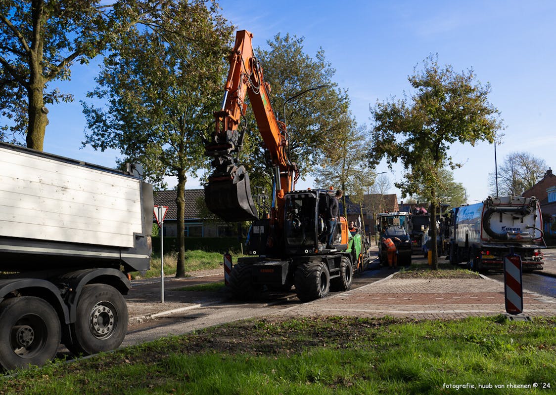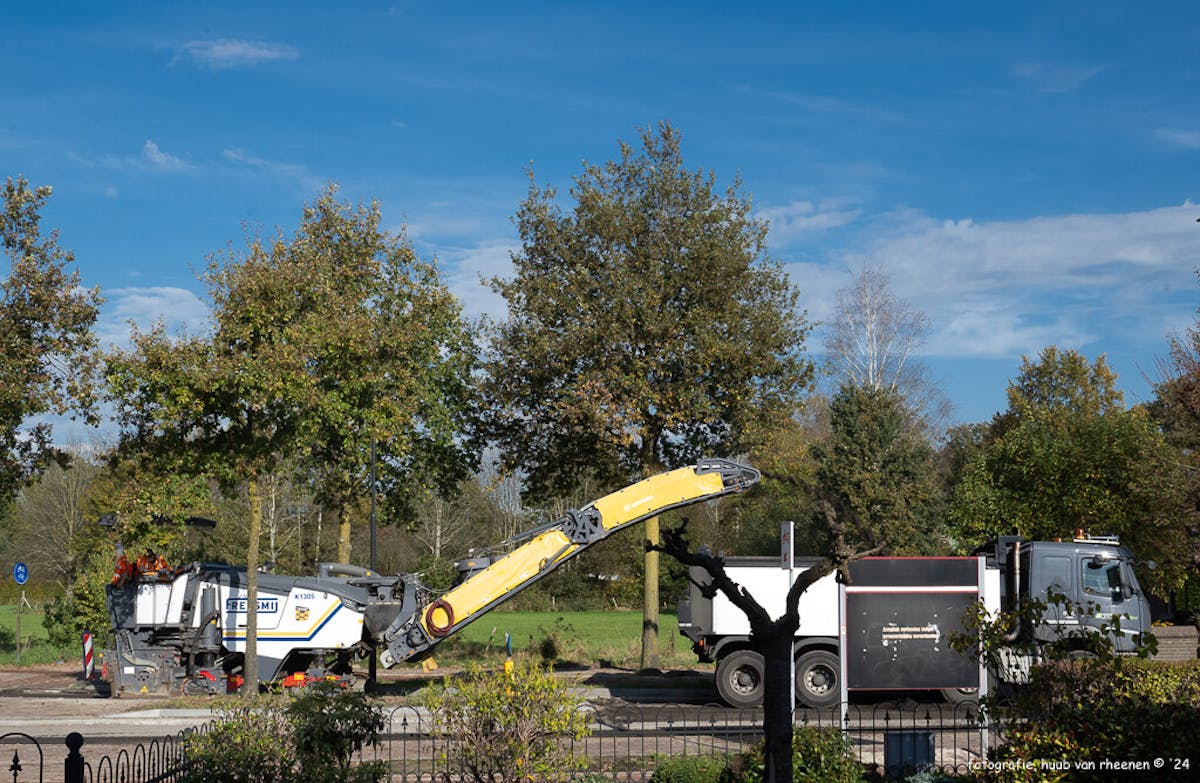 De bestaande asfalt laag wordt met een flinke schraapmachine van de weg gehaald. Alles wordt meteen in grote vrachtwagens gespuwd.
