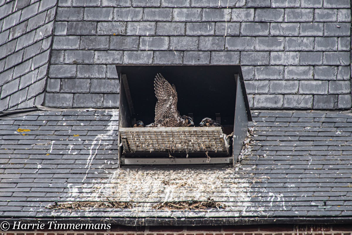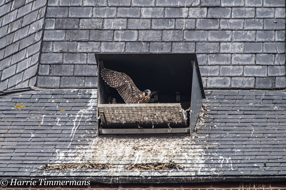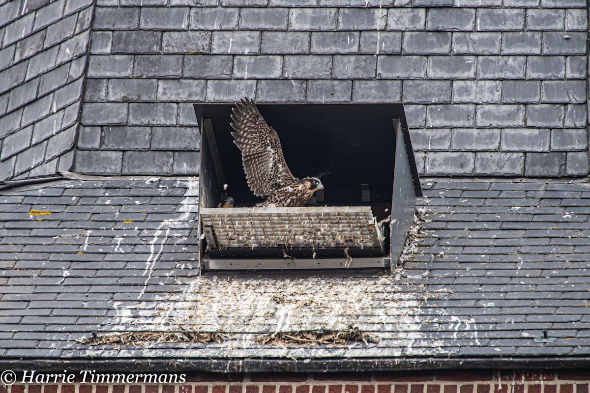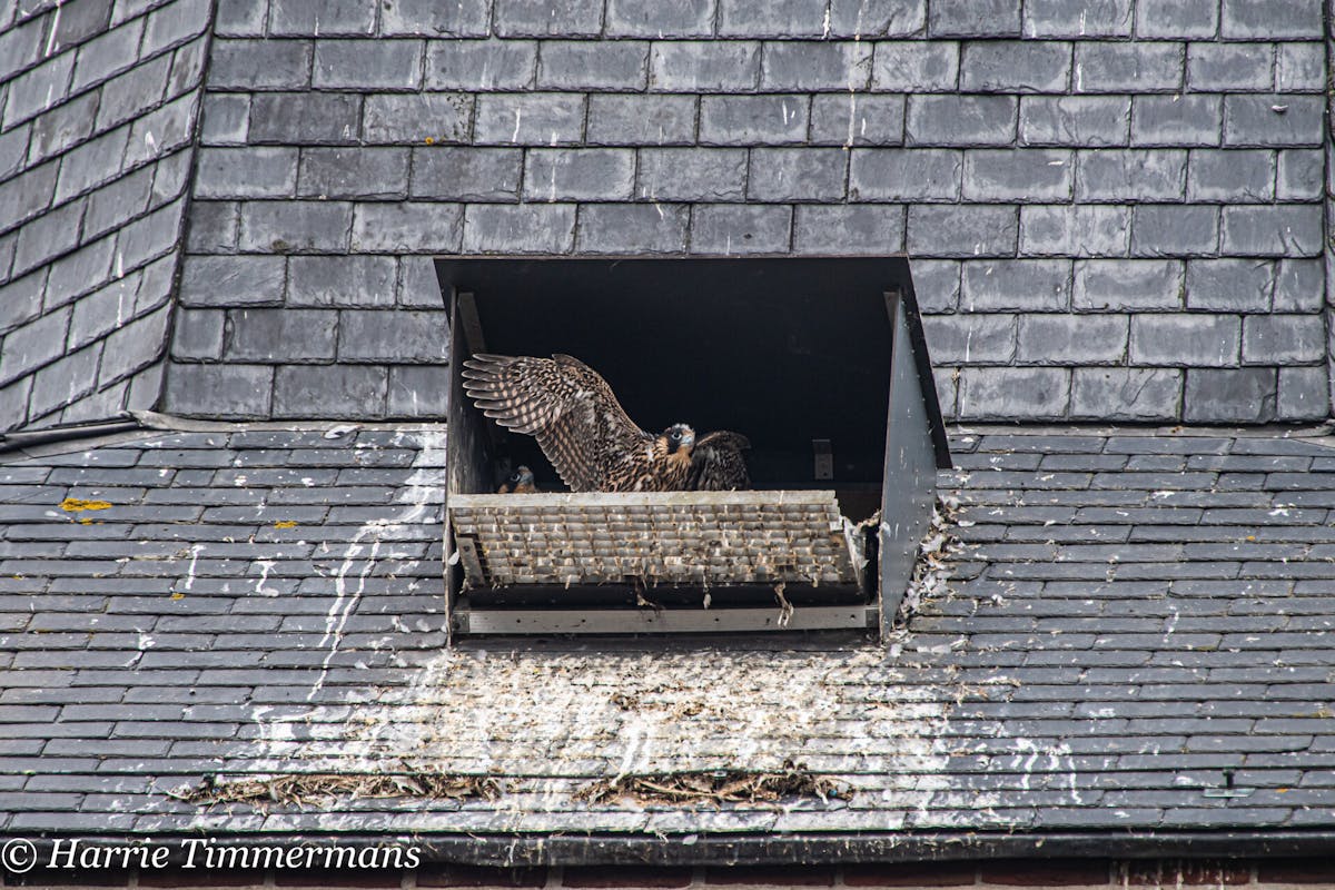 Na het ringen van de jonge Slechtvalken, ook het verloop van de groei van deze Jonge vogels proberen te Fotograferen en hier te laten zien. En deze jonge groeien zo voorspoedig dat hun ook meer energie krijgen , en af en toe een met hun vleugels te slaan .