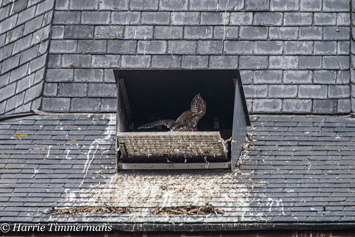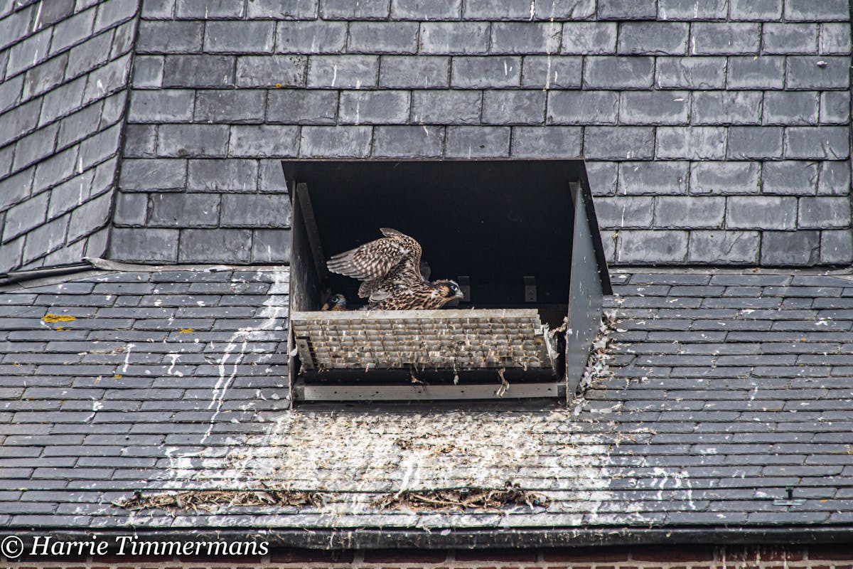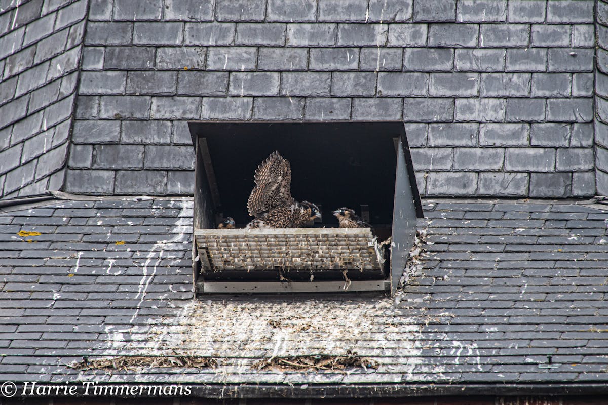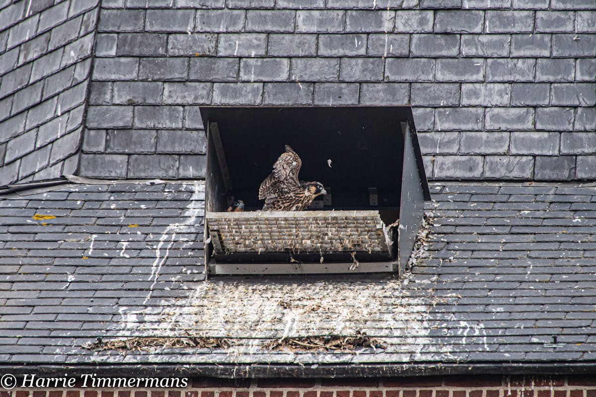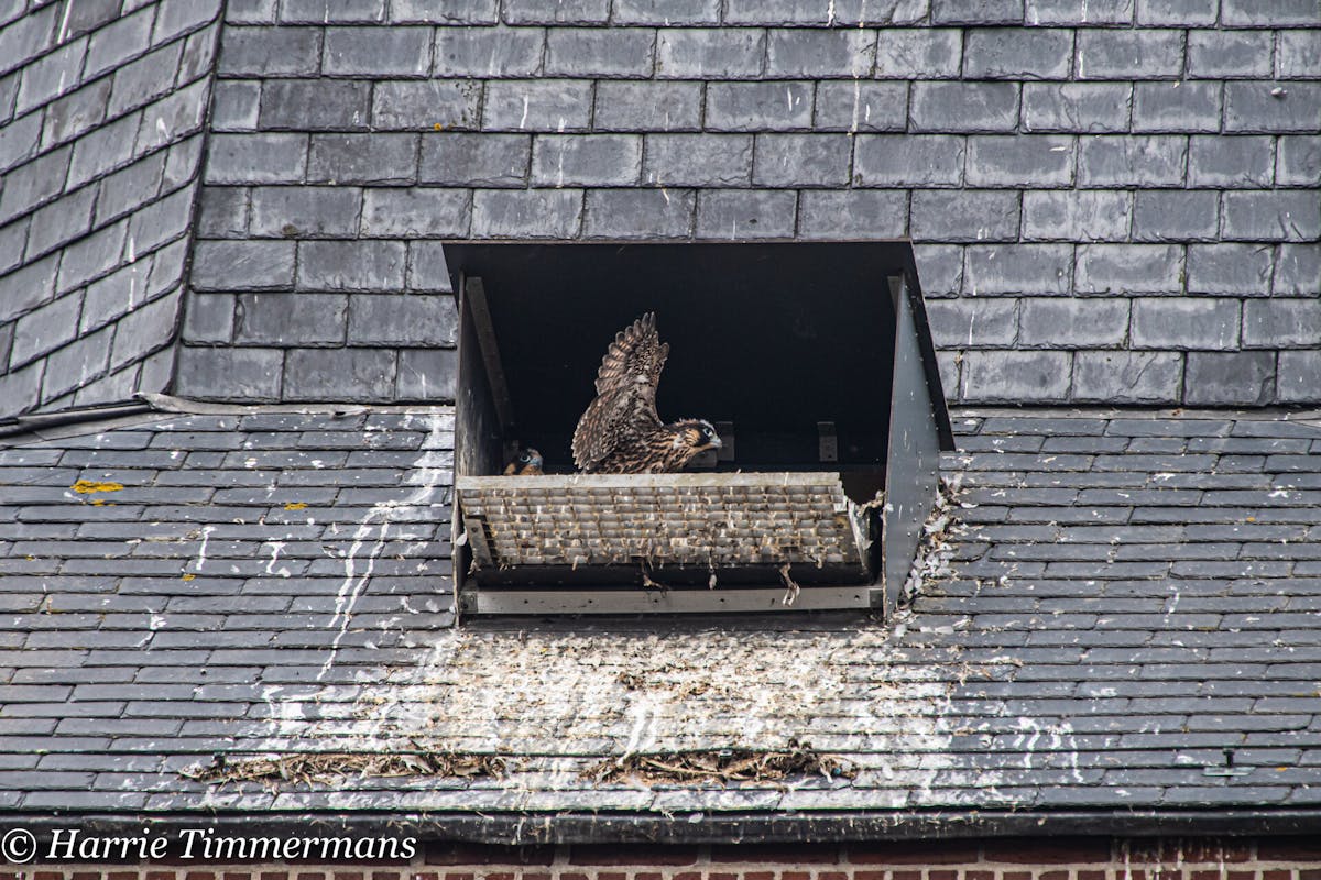 Na het ringen van de jonge Slechtvalken, ook het verloop van de groei van deze Jonge vogels proberen te Fotograferen en hier te laten zien. En deze jonge groeien zo voorspoedig dat hun ook meer energie krijgen , en af en toe een met hun vleugels te slaan .