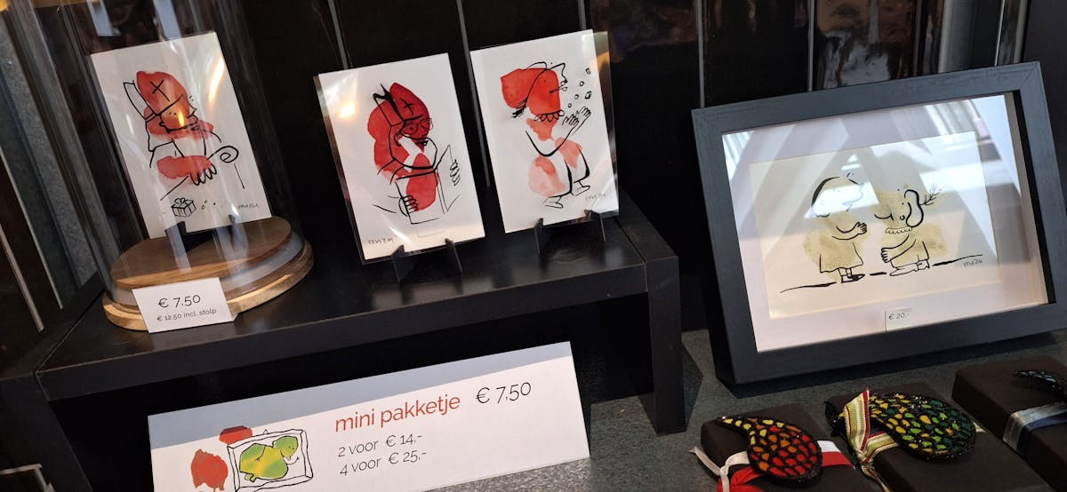 In 't Pakhuys in Alphen heb ik een muurtje met Vlekkendingen die ik maandelijks wissel, zodat je steeds weer verrast wordt met andere tekeningen.