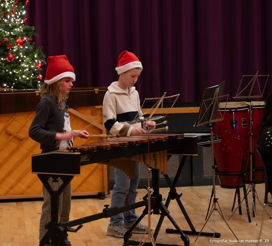 December kent het Sinterklaasfeest, en hoewel al achter de rug, met een swingende medley Sinterklaasliedjes, waarin zelfs de ‘stoomboot’ was te horen, verveelde niet. Zoals Djuri dat kan werd het een ontspannen concert met af en toe een oproep voor de ‘verdwenen’ Slagtime-muzikantjes. Enkele slagwerkleerlingen spelen in beide groepen en dan heb je soms wel eens je verkeerde muziekmap. Dus, zoeken, zoeken en hilariteit alom. Voor het geheel maakt het niet uit. Iedereen kan ervan genieten en ziet hoe Djuri het altijd allemaal weer voor elkaar krijgt.