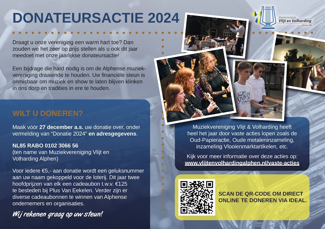 Wil jij ook mee doen; V.&.V. steunen en wie weet een leuke prijs winnen. Scan de QR code in de omslagfoto op onze F.B.-pagina of via de website van V.&.V. of Instragram. Ook kun je een donatiebedrag over maken op NL 85 RABO 0102 3066 56 t.n.v. Vlijt en Volharding Alphen m.v.v. uw naam, adres en “donatie 2024”. Ook dan koppelen we de geluksnummers! Woon je buiten Alphen en je kent onze vereniging van uitvoeringen of acties dan kun je uiteraard meedoen en prijzen winnen. Van harte aanbevolen.
