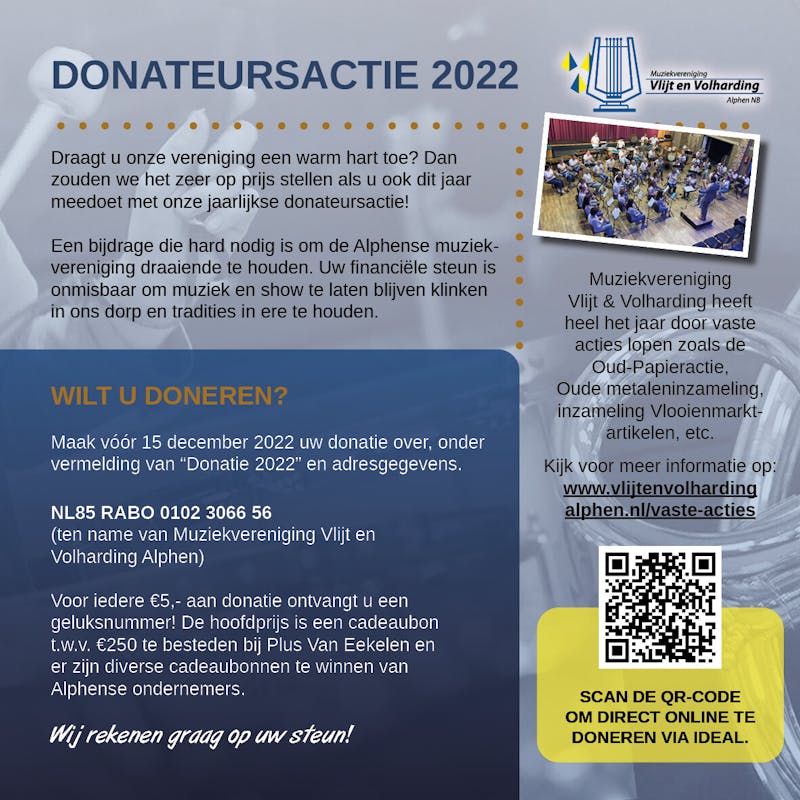 Onze Donateursactie loopt nu bijna 4 weken en velen denken aan onze vereniging. Dank je wel en heel fijn. Zo kunnen we mooie dingen blijven doen met muziek en show! Night of Percussion en nu het komende “Alphen proost” op 7 januari! Ben erbij en start 2023 met deze muzikale happening. Wil je nog een donatie doen, met automatisch kans in de geluksnummerloterij, doneer vóór 17 december a.s. Maak kans op schitterende prijzen; hoofdprijs PLUS-cadeaubon van € 250,- en diverse cadeaubonnen van Alphense ondernemers. Voor iedere € 5,- aan donateursbijdrage ontvangt u een “geluksnummer”. Scan de QR code en volg de aanwijzingen. De trekkingsuitslag wordt in “Ons Weekblad” gepubliceerd en de prijswinnaars krijgen bericht. Dank je wel!