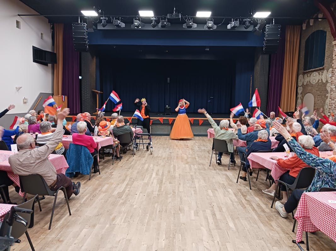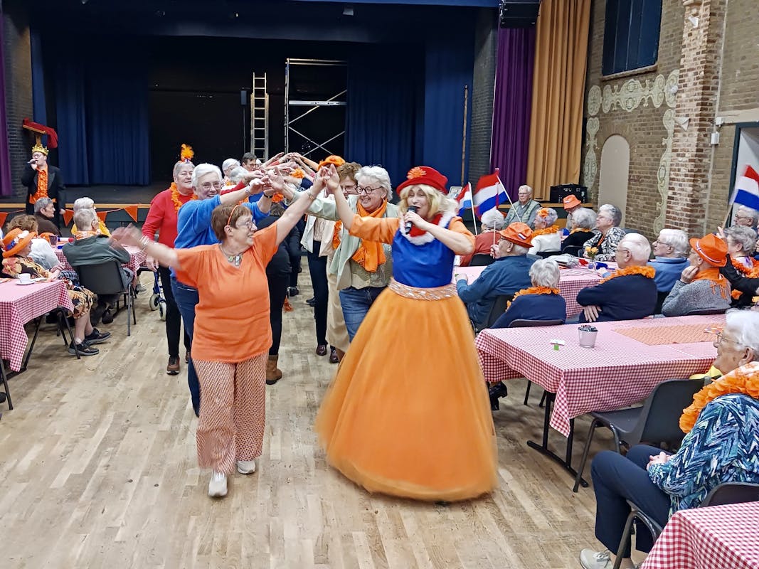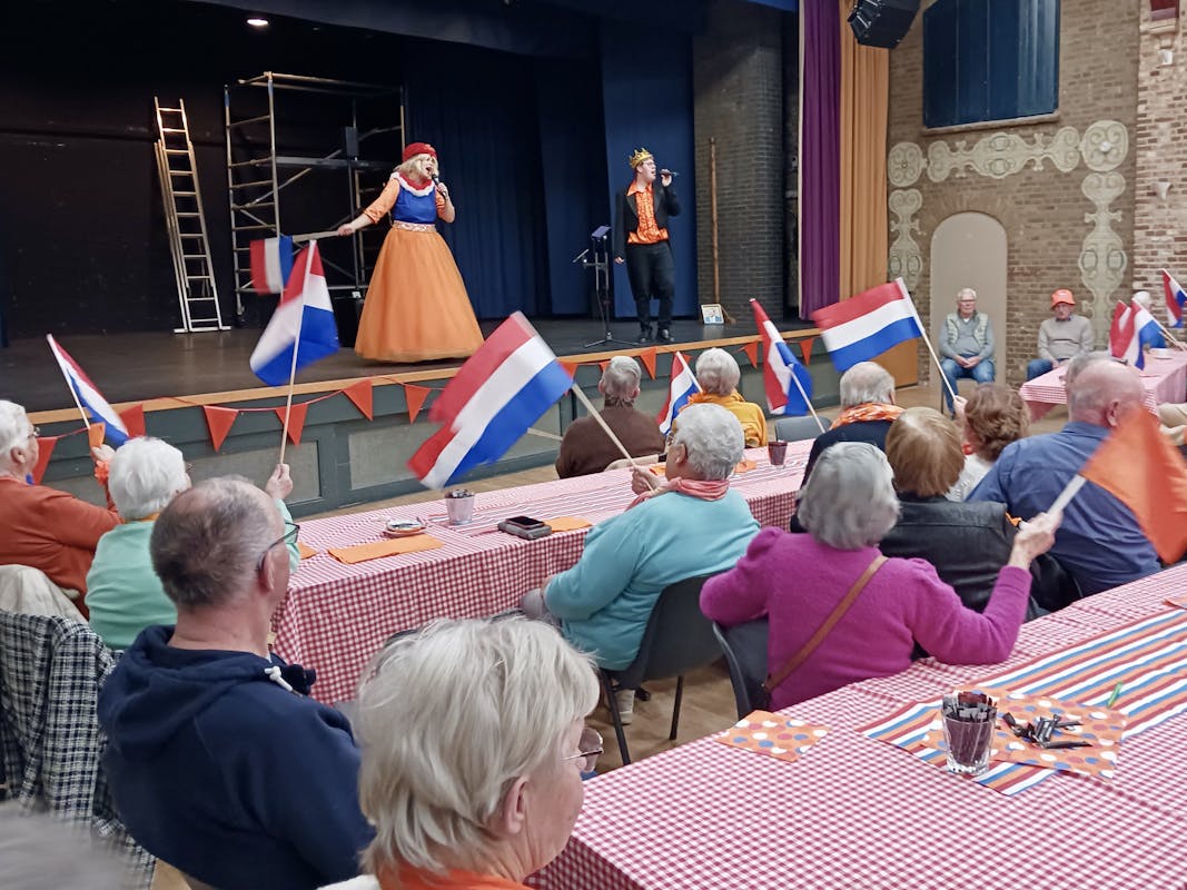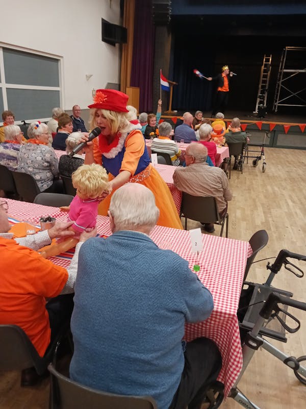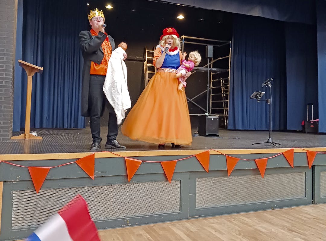 Daarna kwamen tot ieders verassing ‘Max en Willem’ langs die ons met een medley van liedjes alles vertelden over hun ontmoeting, het trouwen en hun liefde voor elkaar. Dus via “In Spanje, in Spanje, in Spanje, in Spanje schijnt altijd de zon” kwamen we na een hele reeks uiteindelijk met “Sweet Maxima, oh, oh, oh”, bij de pauze. Tijdens de pauze nog een lekker drankje en weer door met het oranjefeestje!
