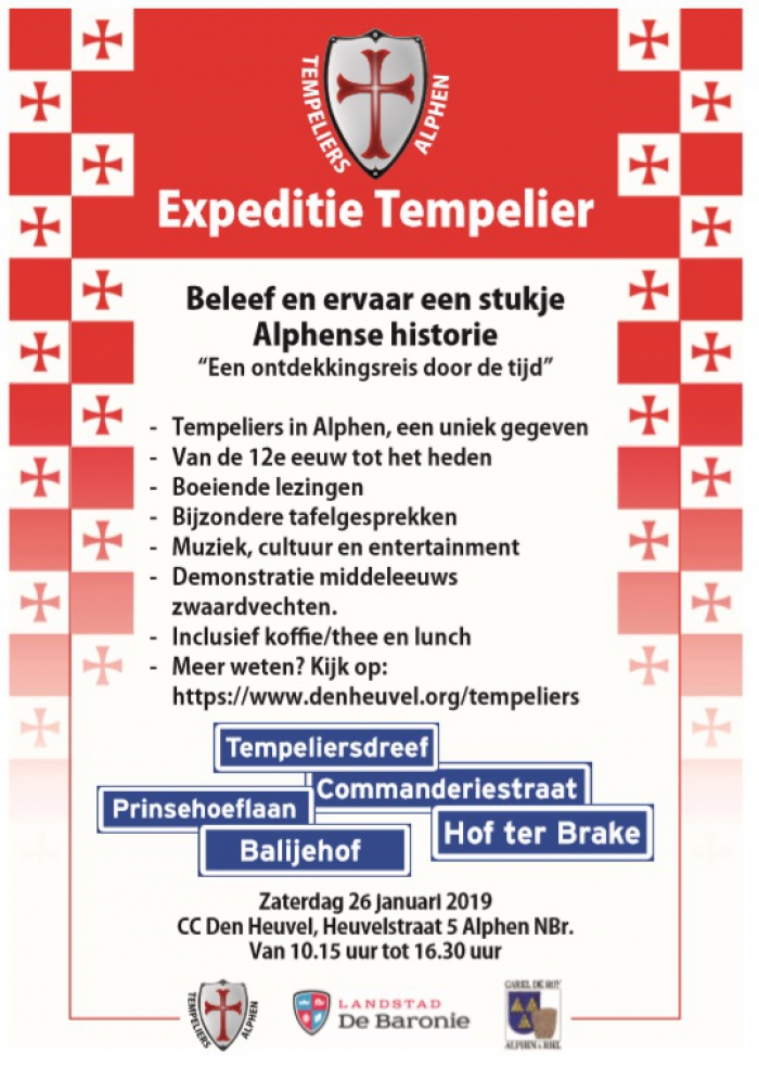 Na deze interessante en gezellige Expeditie Tempelier ga je naar huis met nieuwe informatie over de rijke historie van Alphen. De ontvangst op zaterdag 26 januari is vanaf 10.15u en wordt rond 16.30u afgesloten. Kaarten voor deze dag bedragen €20 (inclusief koffie, thee en lunch) en kunnen besteld worden op https://www.denheuvel.org/tempeliers. Op deze website is ook het complete programma te vinden.