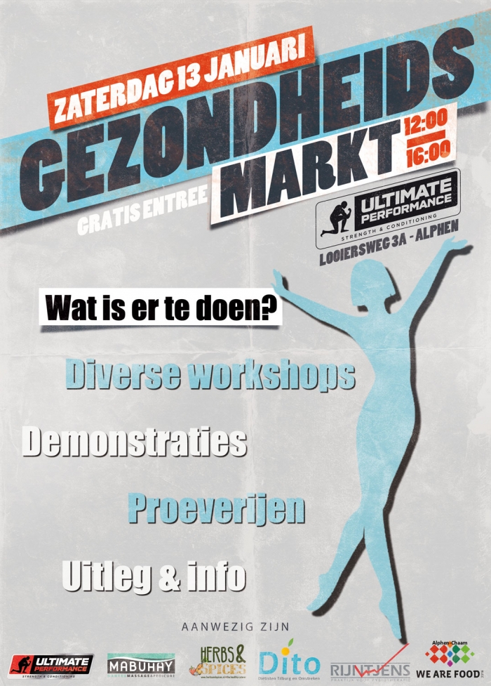 Ultimate Performance GYM, Herbs and Spices, Melba Dantes Massage, Dito diëtist Evelien, Praktijk voor Fysiotherapie Rijntjens en Ergotherapie de Baronie organiseren samen een gezondheidsmarkt op zaterdag 13 januari van 12.00 - 16.00.