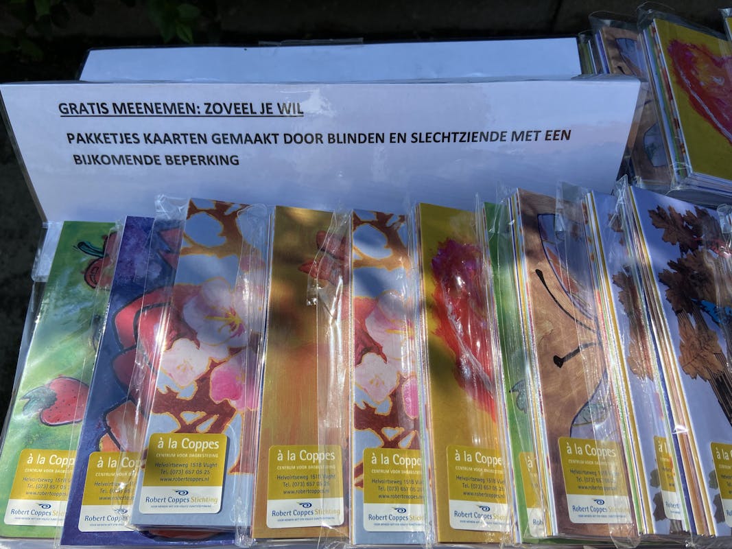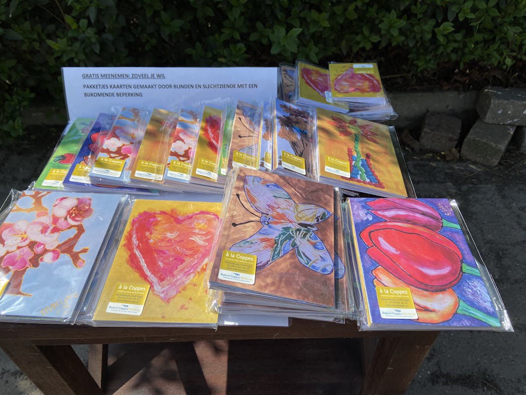 Als u een rondje fietst of loopt. En door de Oosterwijksestraat komt. Staat er aan onze oprit een tafeltje met gratis mee te nemen postkaarten. Deze zijn gemaakt door blinde en slechtziende met bijkomende beperking.(Robert Coppes stichting) Echt prachtige kaartjes. Ik hoop dat u een pakje meeneemt en iemand een lief kaartje stuurt.