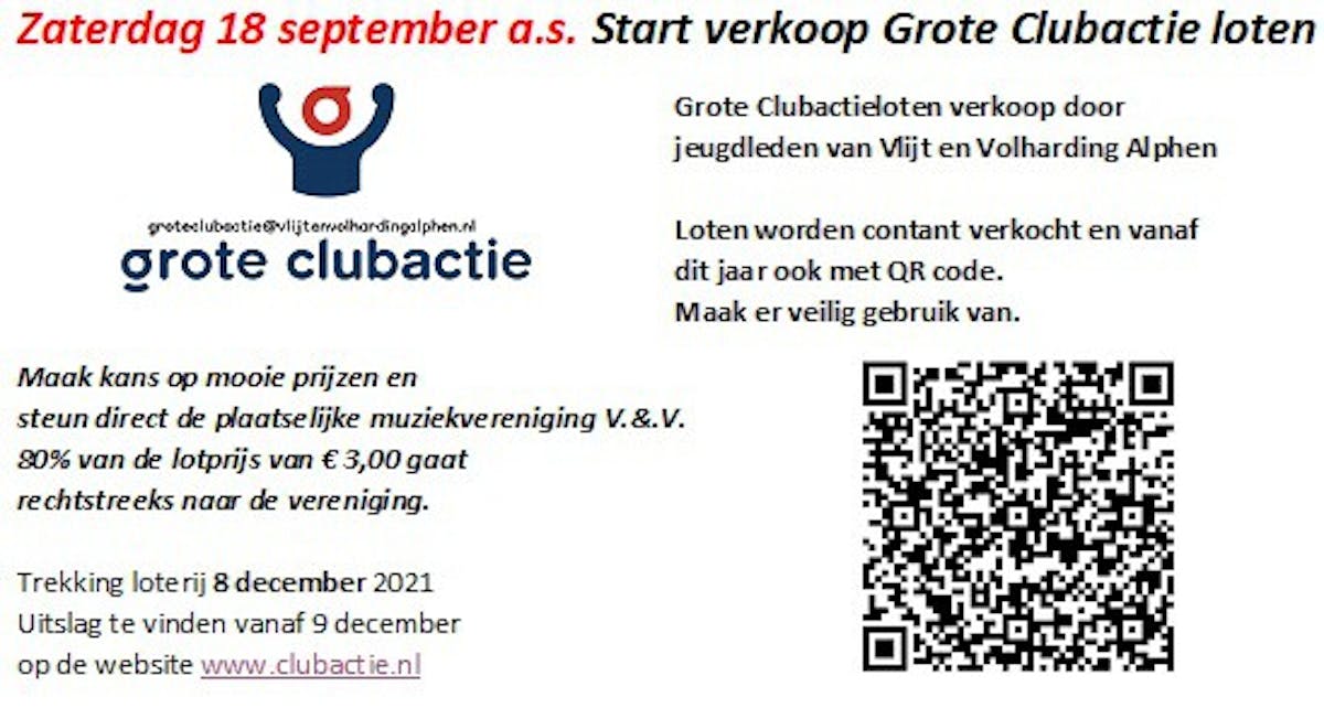 Op zaterdag 18 september gaan de jeugdleden van onze muziekvereniging Vlijt en Volharding Alphen Grote Clubactieloten verkopen. Een aantal leden komt zaterdag 18 september bij je langs de deur met papieren loten. Andere jeugdleden gaan vanaf die dag online loten verkopen met hun eigen QR code! Super makkelijk dus, alles digitaal af te handelen. Een lot kost slechts € 3,00. Hiermee steun je onze vereniging en kun je zelf leuke prijzen winnen, zoals een Keuken Kampioen cheque t.w.v. € 10.000,=, een Seat mii electric of de hoofdprijs van € 100.000,=. Van de opbrengst van het verkochte lot ontvangen wij 80%. Dat kunnen we goed gebruiken voor het onderhoud van onze instrumenten en de kosten van de opleiding van onze jeugdleden. Wil je weten of je prijs hebt! Op woensdag 8 december 2021 vindt de trekking plaats. Vanaf 9 december 2021 kun je via de website www.clubactie.nl controleren of er een prijs op je lot is gevallen. Jij steunt toch ook onze verenging met het kopen van een Grote clubactie lot! Onze jeugdleden staan al klaar om op pad te gaan.