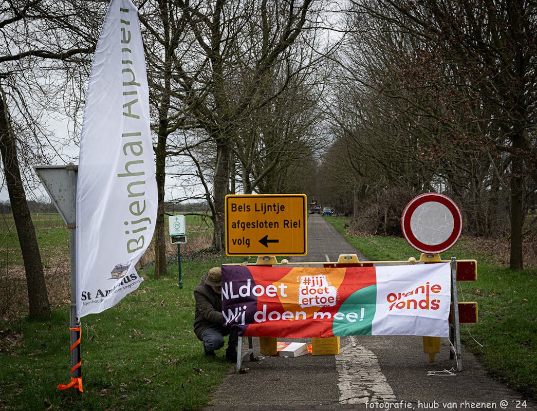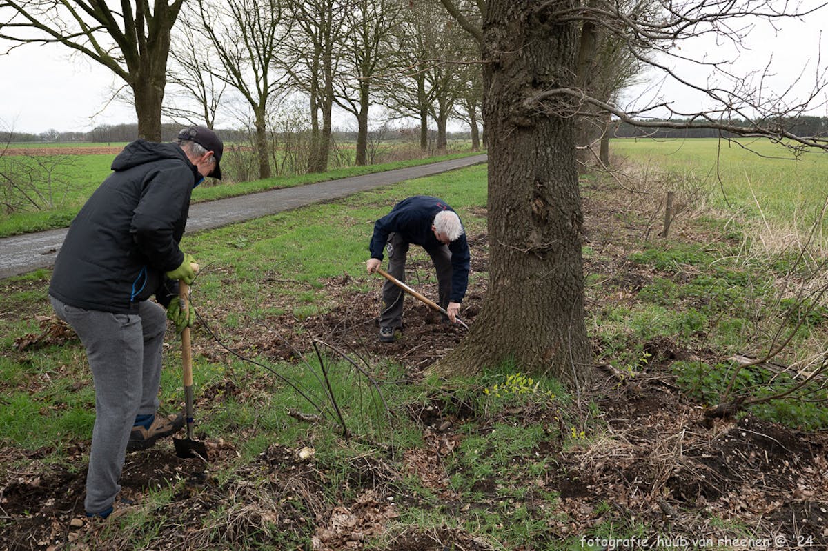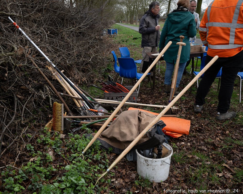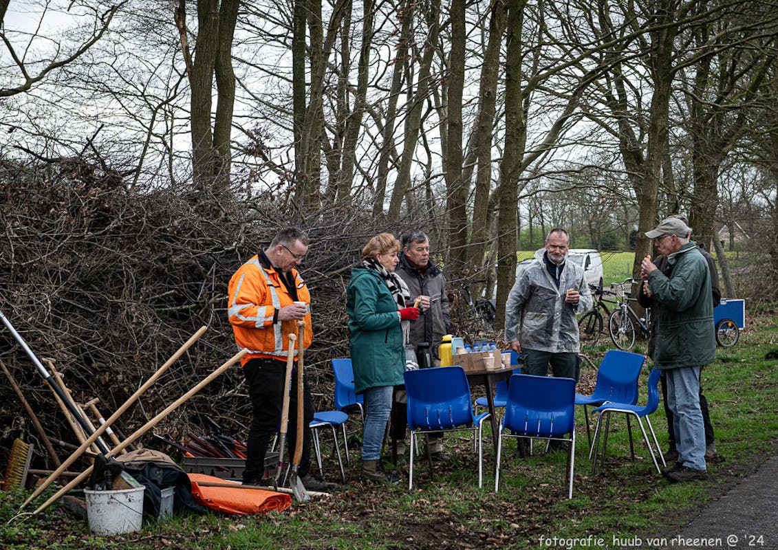 Ondanks dat de temperatuur ietwat tegenvalt in vergelijking met gisteren, (vandaag 8 graden, en gisteren 18 graden), staan er een aantal vrijwilligers klaar, net zoals vorig jaar, om de zijkanten van het Bels Lijntje te ontdoen van onkruid. Na koffie en worstenbrood, werd begonnen met de schep, de Belgische schop, ( had ik nog nooit gezien) dit voor de vele wortels, maar ook met groot materiaal.