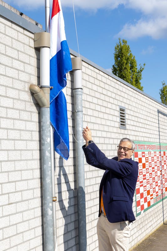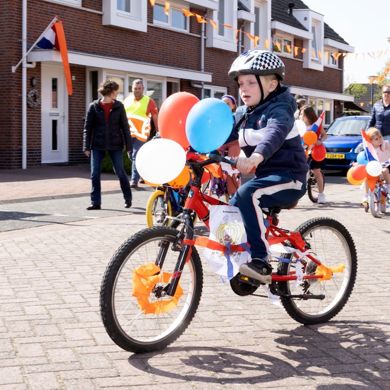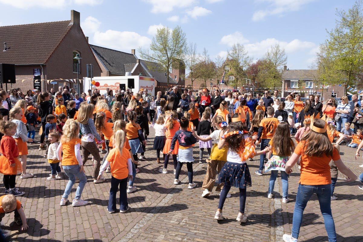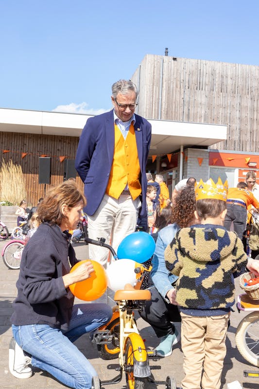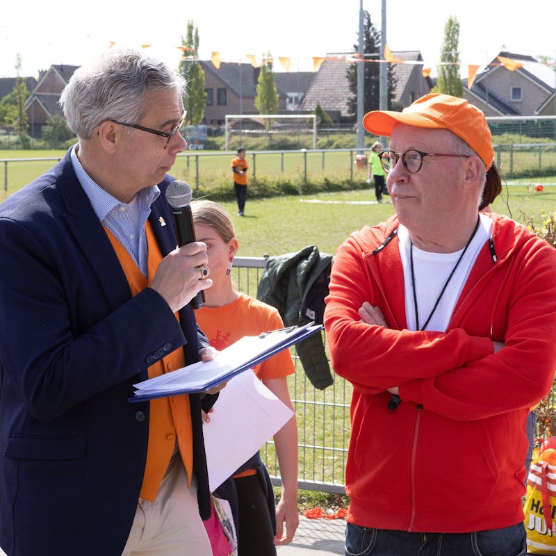 Koningsdag in Alphen-Chaam, Burgemeester Jan Brenninkmeijer hijst vlag in Galder. In Alphen kleurde het Binkplein oranje en door de straten van Chaam was het de mini Acht van Chaam.
