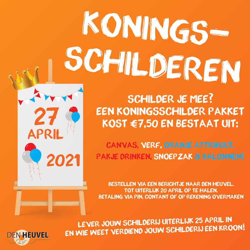 Zorg dat je jouw schilderij voor 25 April bij Den Heuvel weer hebt ingeleverd, zodat we een schilder kunnen kronen tot koning! (Uiteraard mag je je schilderij na afloop weer ophalen!) 👑