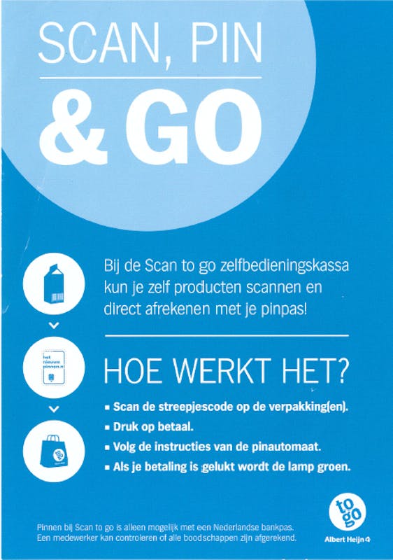 "Gisteren toen ik afrekende bij de zelfscankassa van de AH to go vond ik daar een stapeltje flyers ‘Hoe werkt het?’. Hoewel ik al veel vaker had betaald bij de zelfscankassa (wat de eerste keer ook niet meteen goed ging) had ik deze flyer nog nooit gezien. Mijn vermoeden is dan ook dat deze flyer onlangs is toegevoegd, om fouten met het gebruik te voorkomen. De vraag is echter of dit werkelijk een oplossing is. Kun je problemen met het gebruik van dit soort nieuwe concepten ondervangen met flyers met overzichtelijke stappenplannen of een lijstje FAQ’s?