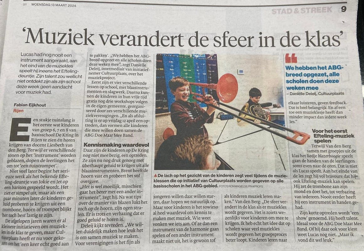 Deze maand is Cultuurplaats samen met de muziekverenigingen uit de ABG-gemeenten gestart met een muziekproject op alle basisscholen (groepen 6, 7 en in Gemeente Alphen-Chaam, Gemeente Baarle-Nassau en Gemeente Gilze en Rijen.