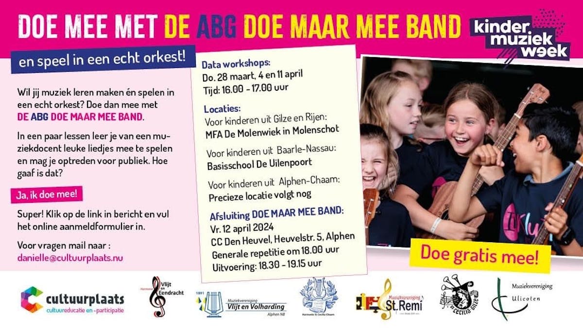 Kinderen die dat willen, kunnen zich aanmelden voor een 3-delige workshop in hun eigen gemeente. Op de donderdagmiddagen van 28 maart, 4 en 11 april repeteren ze om vervolgens allemaal samen mee te spelen in de ABG Doe Maar Mee Band. Dat eindoptreden vindt plaats op 12 april in CC den Heuvel in Alphen.