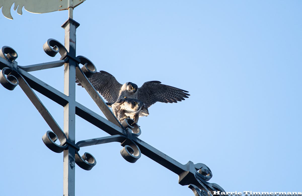 De Slechtvalken doen een poging tot voortplanten, en dan wel boven op het kruis van onze Kerktoren.