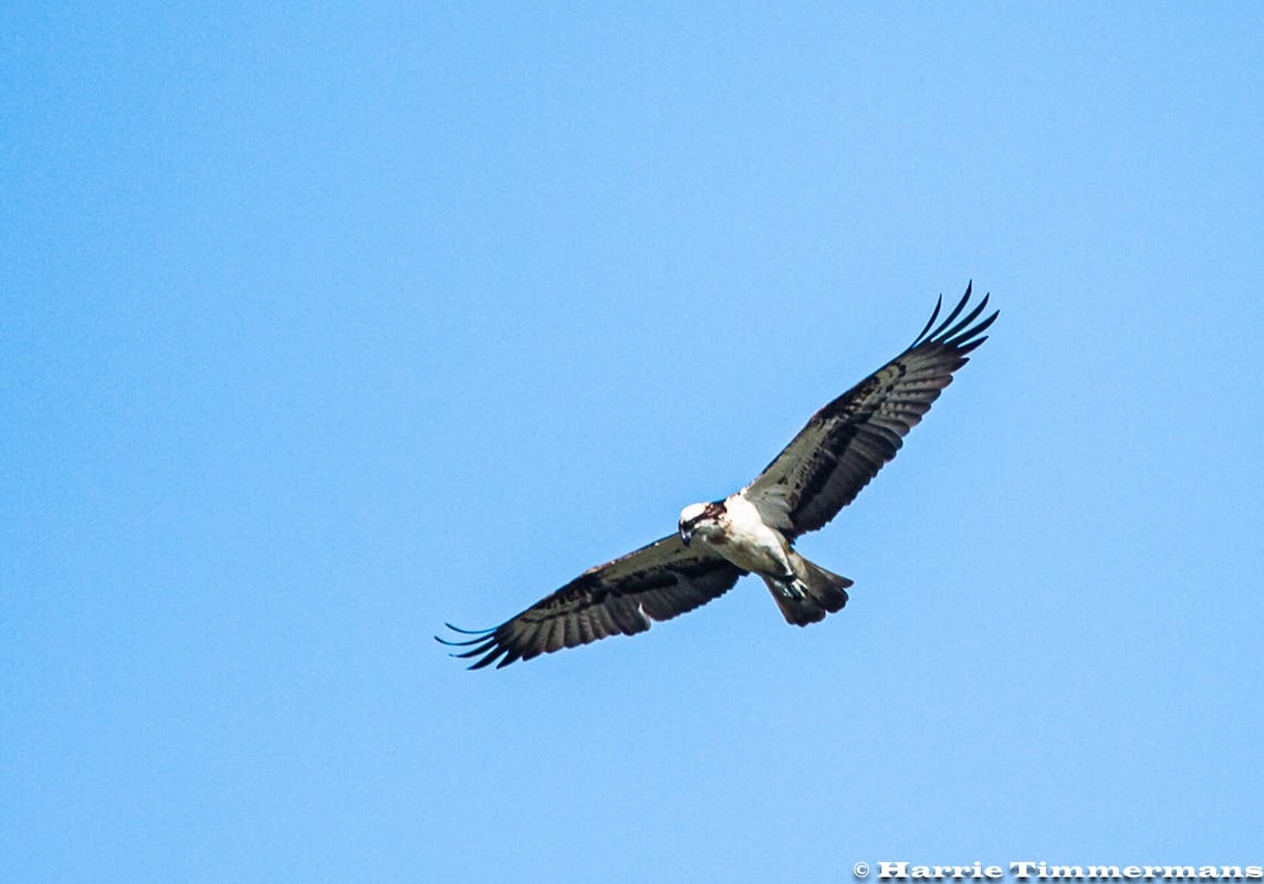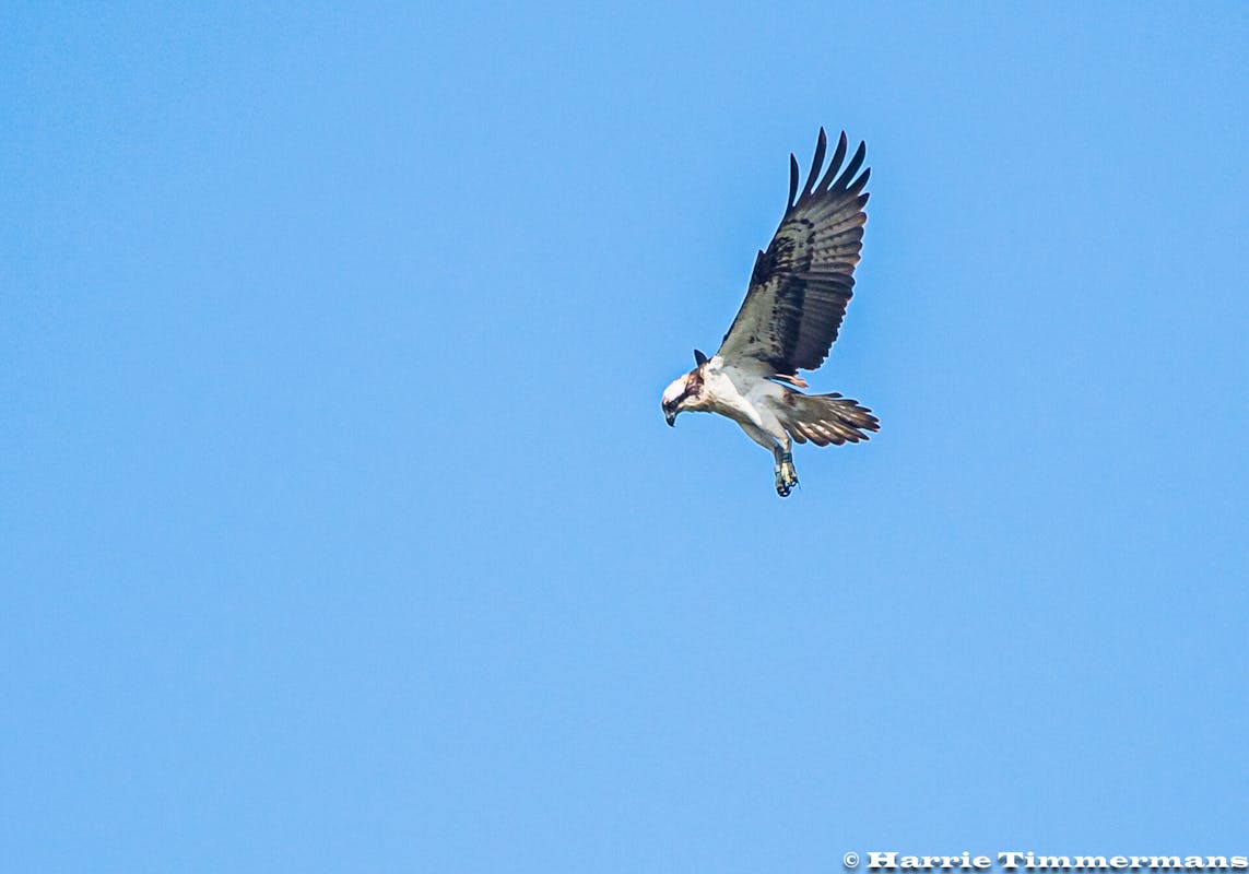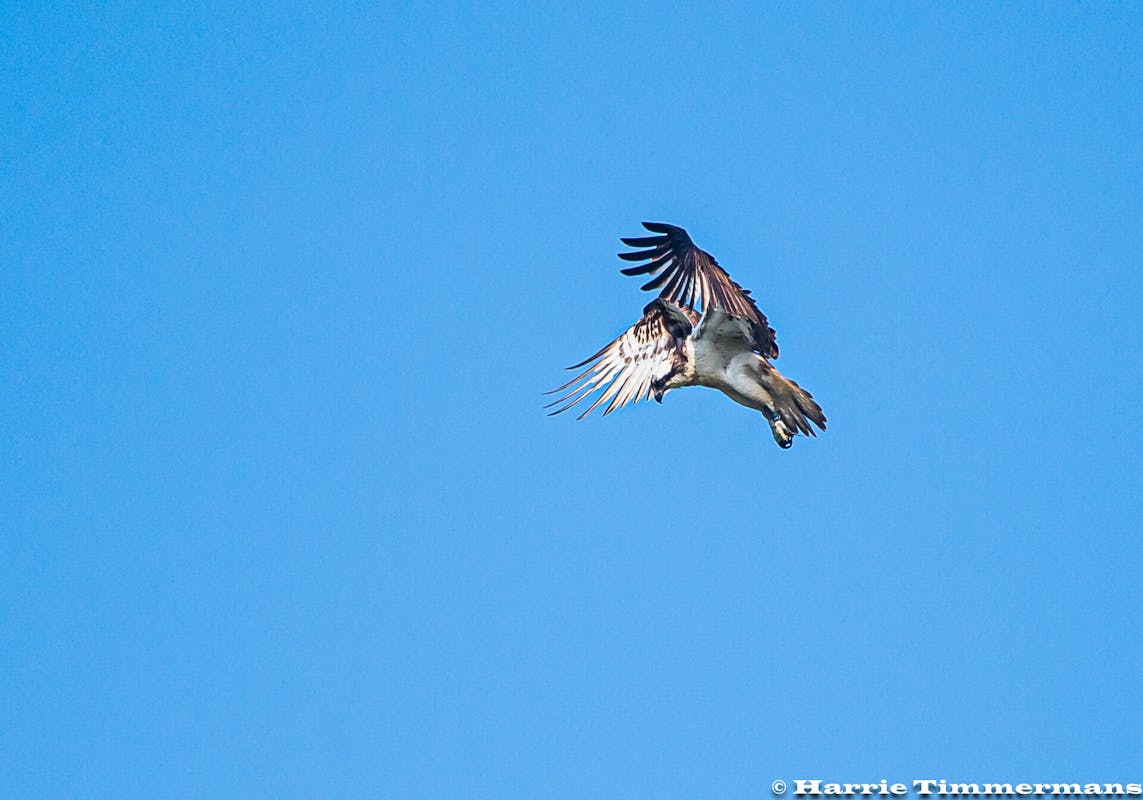 Daar de Visarend (Pandion haliaetus) En de Knobbelzwaan in Vlucht gefotografeerd