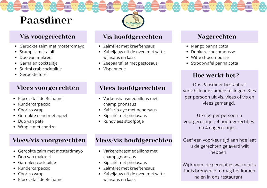 Wij hebben een 3-gangen keuze Paasdiner en een Paas brunch. Bestellen kan online via onze webshop. --> https://belhamel-catering.com/product-categorie/pasen/