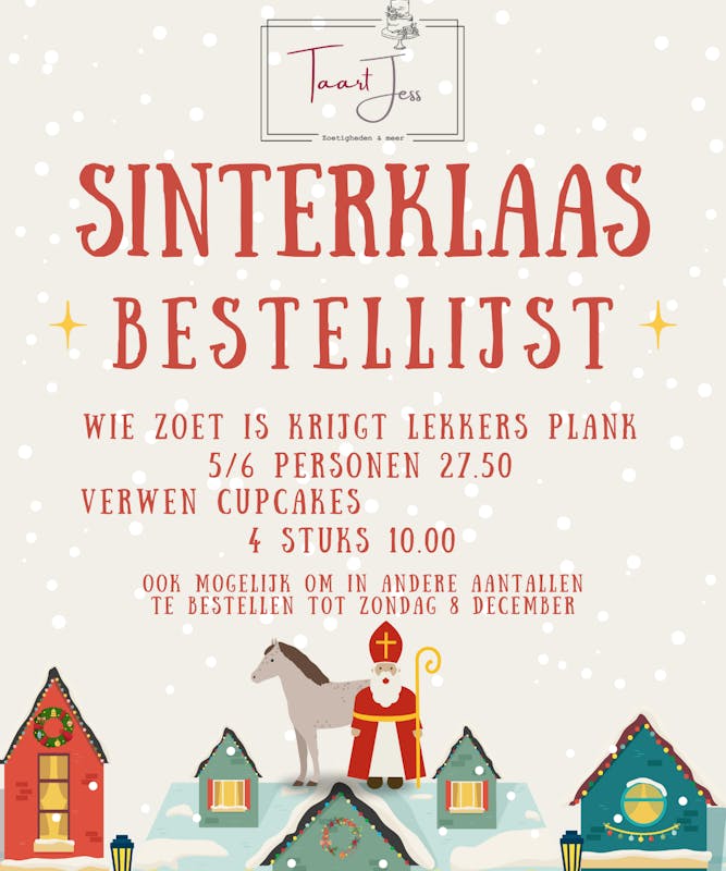 Hij is weer in het land! En dat moet gevierd worden met heerlijke avondjes. Daar horen natuurlijk ook heerlijke zoetigheden bij. Kies je voor een plank vol met kleine zoetigheden of ga je liever voor een Sint gebakjes? Er is vanalles mogelijk bij TaartJess.
