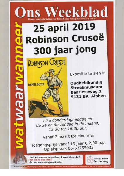 300 jaar geleden schreef Daniel Defoe het boek Robinson Crusoë. Op 25 april 1719 om precies te zijn, verscheen het eerste exemplaar. In die 300 jaar is het verhaal van Robinson Crusoë is zeer veel talen, bewerkingen en uitgaven verschenen. Verzamelaar Toon Timmermans, voorzitter van ons museum, heeft speciaal voor deze gelegenheid een tijdelijke tentoonstelling ingericht met bijzondere exemplaren van het boek. Van zeer oud tot heel opvallend en in de meest opmerkelijke talen.