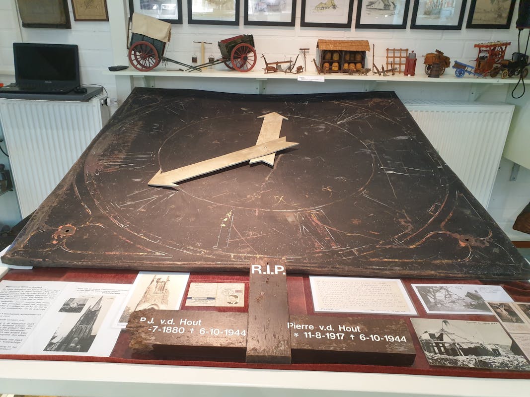 Daarnaast ligt er ook een naar beneden gedonderde wijzerplaat van de uit 1910 daterende torenklok en nog meer overgebleven oorlogsspul.