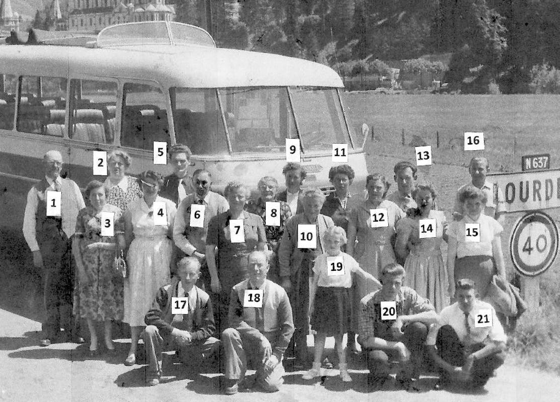Van verschillende kanten kregen wij hulp bij het bijeen sprokkelen van namen van mensen die op de foto staan. De foto die ongeveer 65 jaar geleden gemaakt is, en waarop de bedevaartgangers staan die met een bus van Jos van Raak deze reis toen maakten. Om duidelijk te maken wie deze mensen zijn hebben wij hen op deze afbeelding van een nummer voorzien. Hierbij geven wij de namen van de deelnemers aan deze bedevaart: 1. Jan Valgaeren; 2.Louisa Remeijsen; 3. Dymphena (Dien) Meeuwesen; 4. onbekend; 5. Huub Gulickx (priester geworden); 6.Willeke Smeekens (kleermaker); 7. Cor Verhoeven (zus van Frans Verhoeven de post); 8. Jo Govers- van Riel; 9. Jeanne Govers; 10. Anneke Leenaerts; 11. onbekend; 12. Trees Verhoeven (getrouwd met Piet Adriaansen); 13. Sjef Huijben; 14. Lieske de Leeuw (dochter van de Melkboer); 15. Til Mathijssen (getrouwd met Suske Horevoorts); 16. Jos van Raak; 17. Woutje van den Broek; 18. Adriaan (Jaon) Govers; 19. onbekend; 20. Toon Verheijen en no. 21; Jan van Gorp (De Boer). Dan hebben wij ook nog de volgende namen door gekregen van mensen die op deze foto (zouden) staan: Cee Backx; Roos de Leeuw; Riet van Gorp; Wies Kools (Terover); en als laatste To Verhoeven-Buyks. Er zullen ongetwijfeld fouten in deze opsomming staan want wij hebben ook verschillende namen doorgekregen die niet allemaal correspondeerden met dezelfde personen op de foto. Deze mensen kwamen ook niet alleen uit Alphen en Riel, maar ook uit Baarle-Nassau (Hertog), Ulicoten en Chaam. Wij zetten deze foto van de pelgrimtocht naar Lourdes nog een keer in deze aflevering zodat u allen nog eens de namen kunt bekijken van de mensen die deze reis toen hebben meegemaakt. Vast en zeker een grote belevenis voor deze deelnemers, zeker in die tijd!