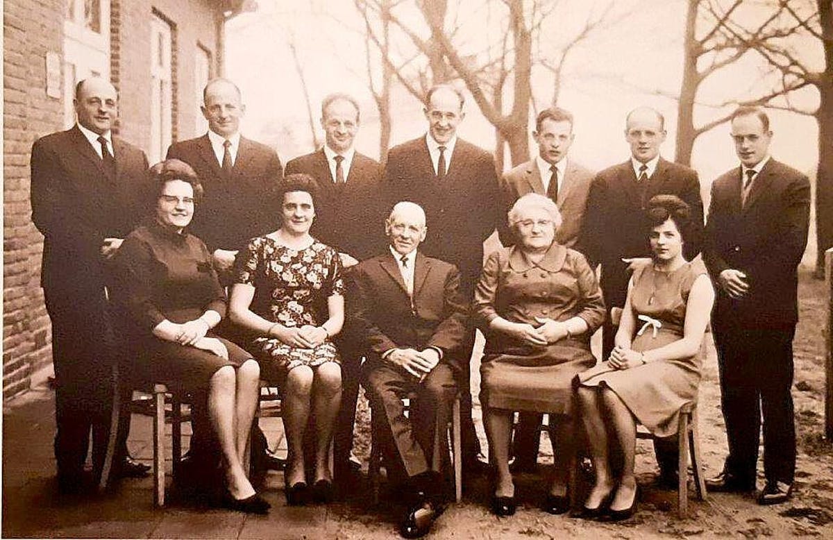 Deze afbeelding is genomen in 1965 ter gelegenheid van het 40-jarige huwelijksfeest van Adrianus/Jaonneke de Jong en Anna de Jong- van Gorp. Wij geven hierbij alle namen van de familie De Jong met de kinderen en beginnen bovenaan van links naar rechts: Ad; Kees; Jan; Toon; Albert; Wim en Bernard. Onderste rij zittend ook weer v.l.n.r. Riet; Jo; Pa Adrianus de Jong; Moeder Anna de Jong-van Gorp en als laatste Wil.
