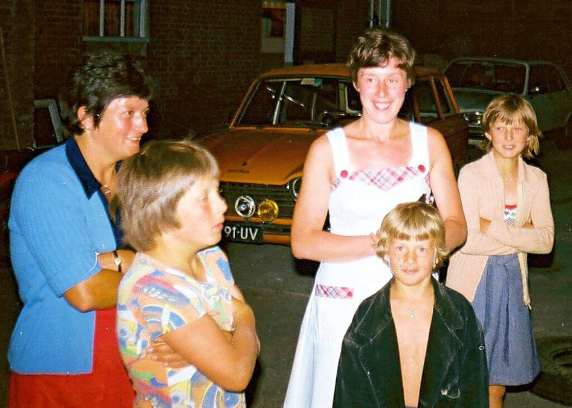 Op de foto van vorige week die we in deze aflevering ook opnieuw plaatsen om uitleg te geven, stonden 2 schoonzussen van elkaar. De meest linkse op de foto was Nel van Gorp en zij vormt een echtpaar met Kees Bruers. De dame rechts op de foto is Jeanne van Rooij die getrouwd is met Ton van Gorp. Nel en Ton zijn zus en boer en zijn beide kinderen van Kees van Gorp (Tieste) en zijn vrouw. Vervolgens staan op deze afbeelding v.l.n.r. de kinderen Bruers, Kees, Ronnie en Ellie. Wij denken dat deze foto ongeveer 45 jaar geleden zal zijn gemaakt. De auto op de achtergrond had nog een blauw kenteken en dat is al ruime tijd niet meer zo. Deze foto is hoogstwaarschijnlijk gemaakt op het Looneind. Tot zover deze mooie foto.