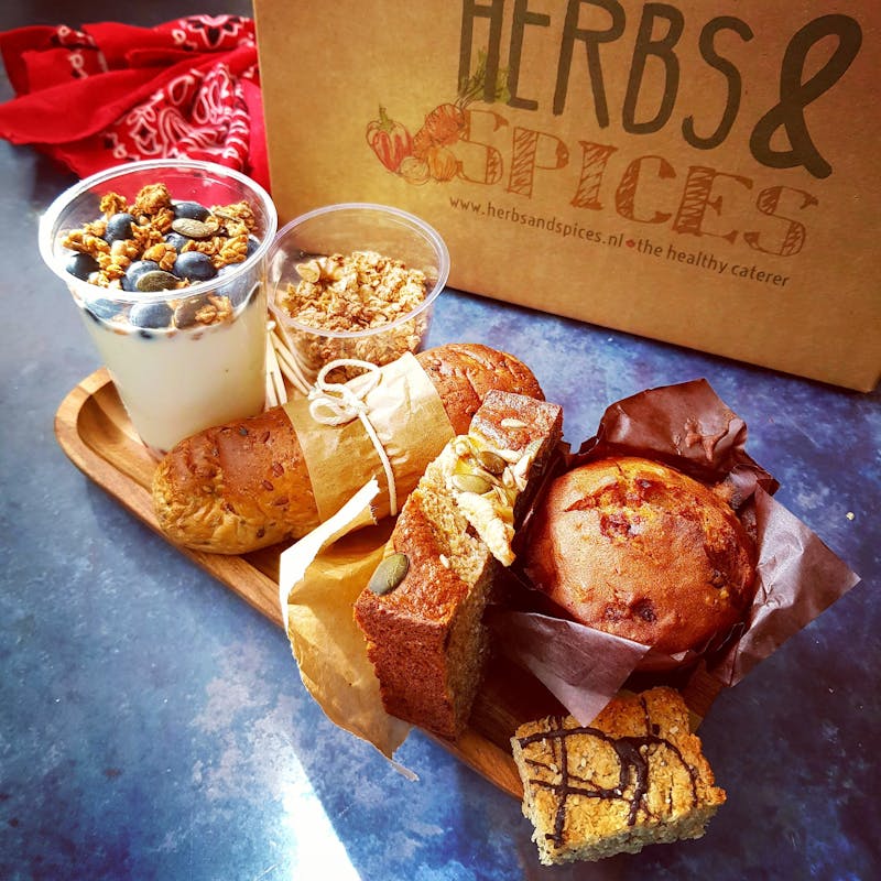Deze zalige frambozenmuffin, een dikke plak bananenbrood, een overvolle beker met boeren bio yoghurt, granola en fruit, een energiekoek én een zalig gezond Koolhydraatarm worstenbroodje!