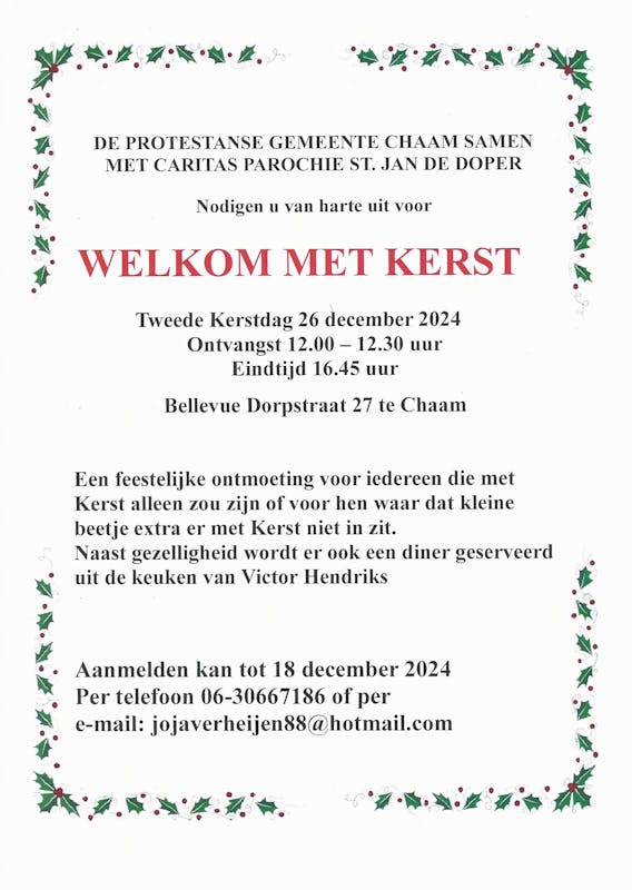 Deze bijeenkomst wordt georganiseerd door de Protestantse gemeente Chaam en Caritas Parochie St.-Jan de Doper.