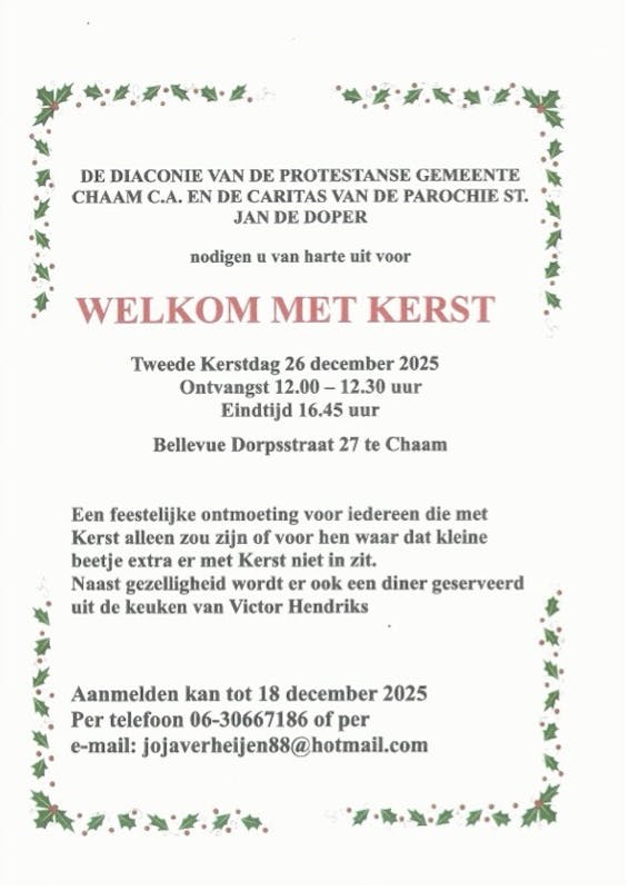 Deze bijeenkomst wordt georganiseerd door de Protestantse gemeente Chaam en Caritas Parochie St.-Jan de Doper.