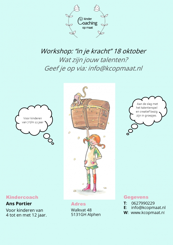 In de week van 2 t/m 7 okober kennismaking met kindercoaching op maat. Maak een afspraak en ik plan een gratis intake voor u in ! Ans Portier T: 0627990229 E: info@k...