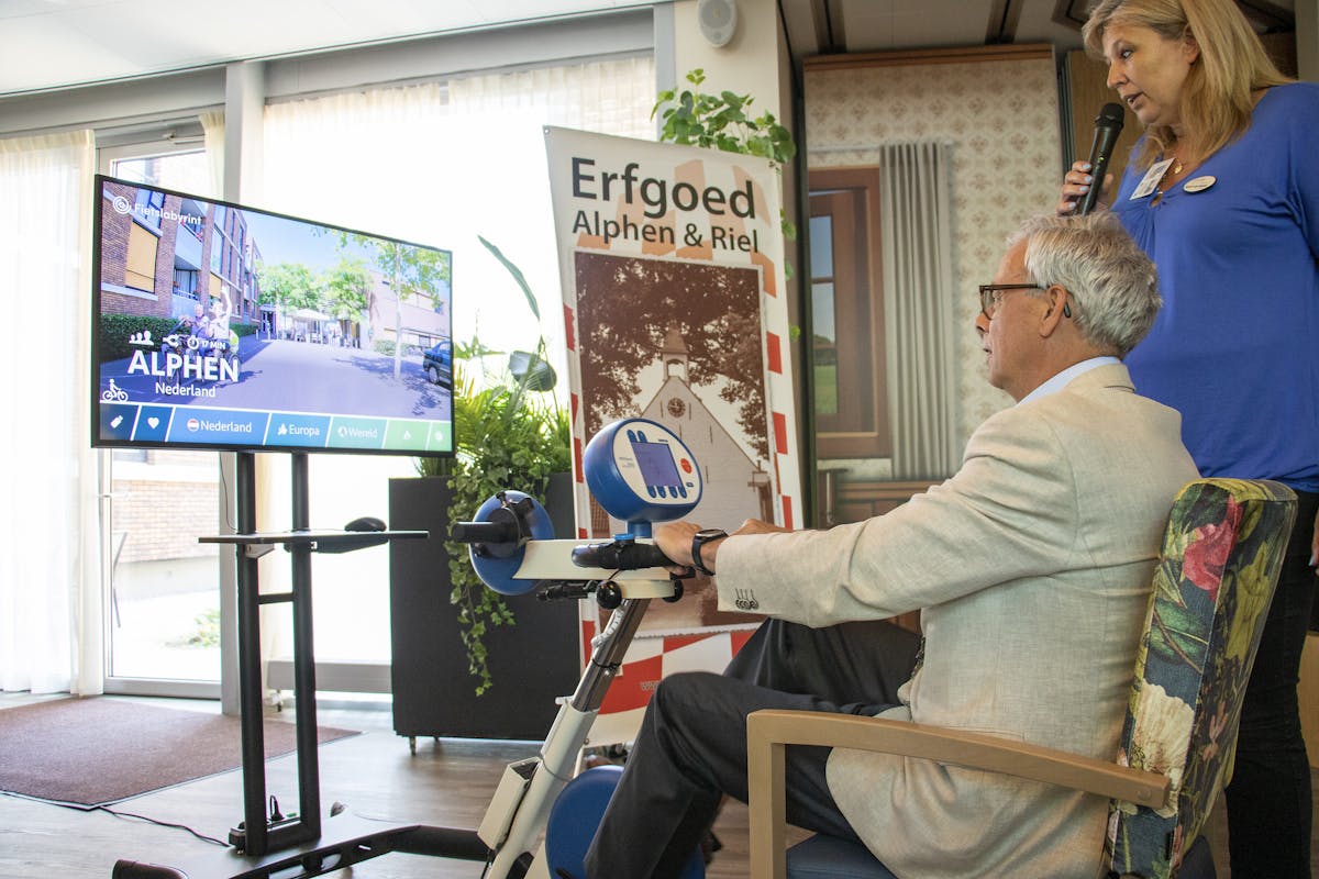 Fietslabyrint maakt het voor mensen die niet meer zelfstandig naar buiten kunnen mogelijk om waarheidsgetrouwe, virtuele, interactieve fietstochten te maken. Het beeldscherm waarop de fietsroutes worden getoond, is aangesloten op een hometrainer of andere bewegingstrainer. Stopt de fietser met trappen, dan stopt ook de fietsroute op het scherm. De beelden zijn levensecht en op keuzemomenten kiest de fietser zelf welke kant hij op wil, wat zorgt voor een unieke ervaring. Fietslabyrint maakt het simpel om in beweging te blijven op een ongedwongen manier. Zo brengt Fietslabyrint een stukje buiten naar binnen. De medewerkers van Thebe de Hoogt waren dan ook snelt enthousiast toen ze hierover hoorden. Karin van Eupen: “Er zitten nu al zo’n 600 routes wereldwijd in het programma. Maar daar waren natuurlijk nog geen routes door Alphen bij. Om dat te kunnen realiseren hebben we om een financiële bijdrage van de gemeente Alphen-Chaam gevraagd. Fijn dat ze daar positief in stonden. En om het voor onze bewoners nóg levensechter te maken hebben we contact gezocht met Frans de Leeuw van Heemkundekring Carel de Roy. Frans heeft bergen werk verzet door oude dorpsfoto’s te zoeken en die op het juiste moment in de routes te plaatsen. Daardoor wordt het oude dorpsbeeld met het huidige beeld verbonden; mooi om te zien!” Als dank voor het vele werk werd Frans een boeket bloemen aangeboden.