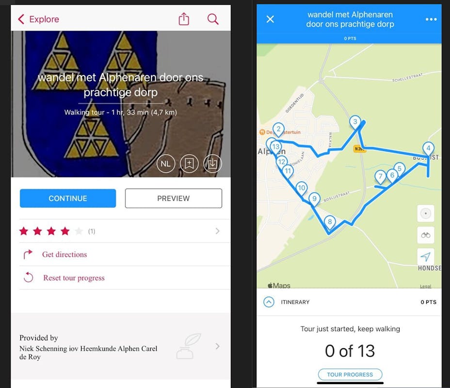 Je download de gratis WandelApp Alphen op je telefoon en je start bij het Streekmuseum Alphen midden in het dorp. De App geeft aan waar je heen moet wandelen. Op een interessant punt aangekomen zie je een stip of ster en als je daarop tikt verteld iemand het verhaal van die plek. Zo krijg je geleidelijk veel mee van de Alphense geschiedenis en samenleving.