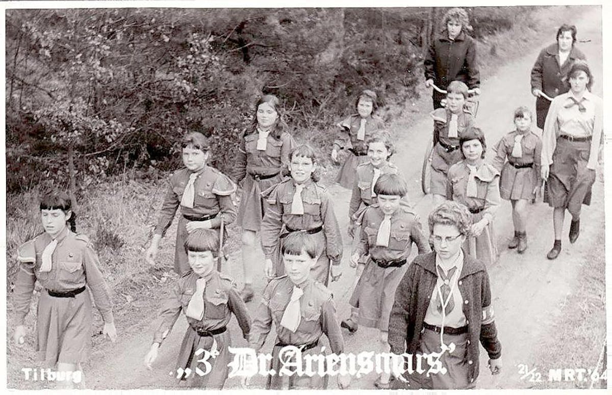 Kabouters uit Alphen lopen de 3e Dr. Ariensmars in Tilburg. Deze mooie foto ontvingen wij van Lia in ’t Groen- Jansen en is gemaakt in maart 1964. Wij zijn zelfs in het bezit gekomen van bijna alle namen van de kabouters die op deze afbeelding staan.