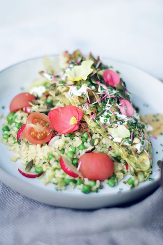 Vegan Bulgogi bowl met gegrilde little gem | Bulgur | Beukenzwammen | Geroosterde rode ui | Geroosterde paprika | Vinaigrette van appelazijn en geroosterde sesamolie