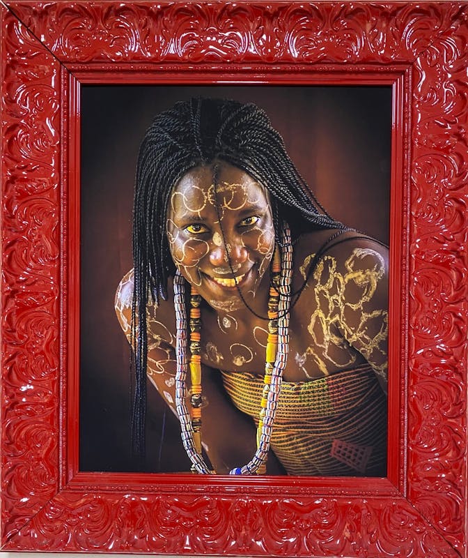 Hierbij een voorbeeld uit Ghana: De dame is gekleed in traditionele kleding en sieraden. In die streek beschilderen ze zich graag. Ze heet Agnes en ze kijkt naar jou. De rood gelakte lijst maakt alles compleet. Alles te zien zaterdag 13 april a.s. bij Hugo, bezoekadres Stationstraat 38 (via Remijsenhof).