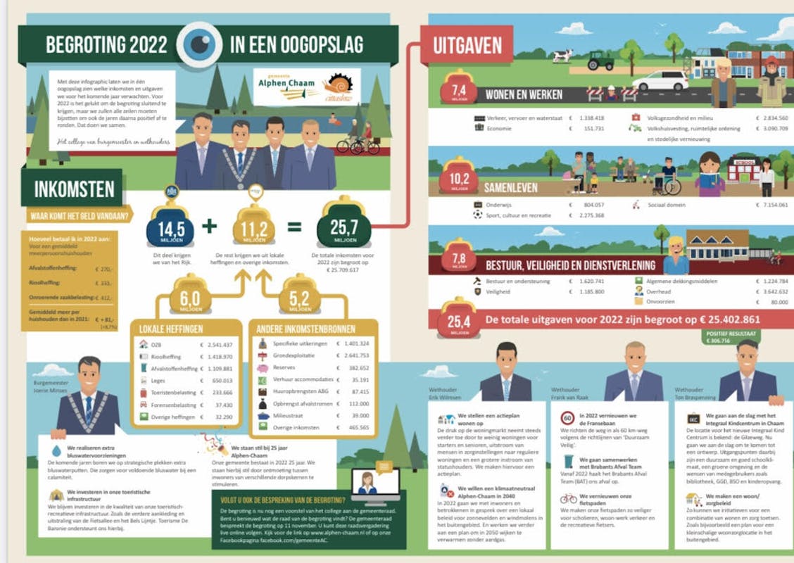 Bekijk in één oogopslag hoe de gemeente Alphen-Chaam aan haar geld komt en waaraan we dat het komende jaar uitgeven: Begroting 2022 in één oogopslag