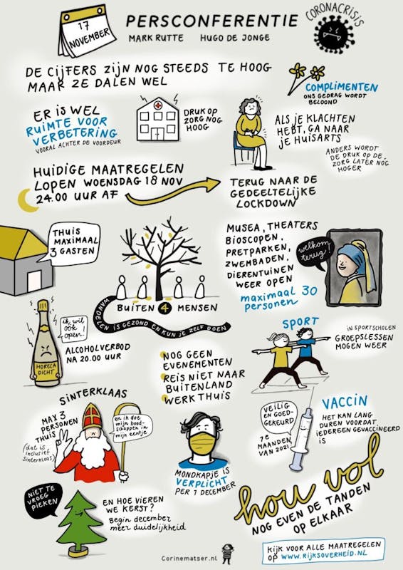 Corine Matser tekende een samenvatting van de persconferentie van 17 november. Deze kun je vinden als foto bij dit bericht.