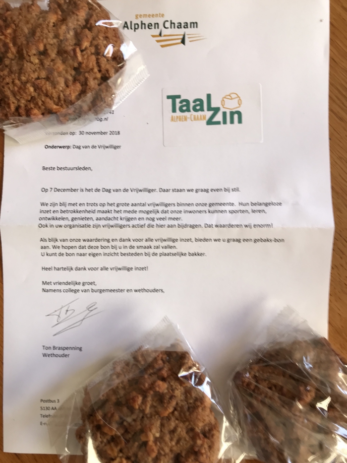 Ook de TaalZin Vrijwilligers ontvingen een gebaks-bon van de gemeente.