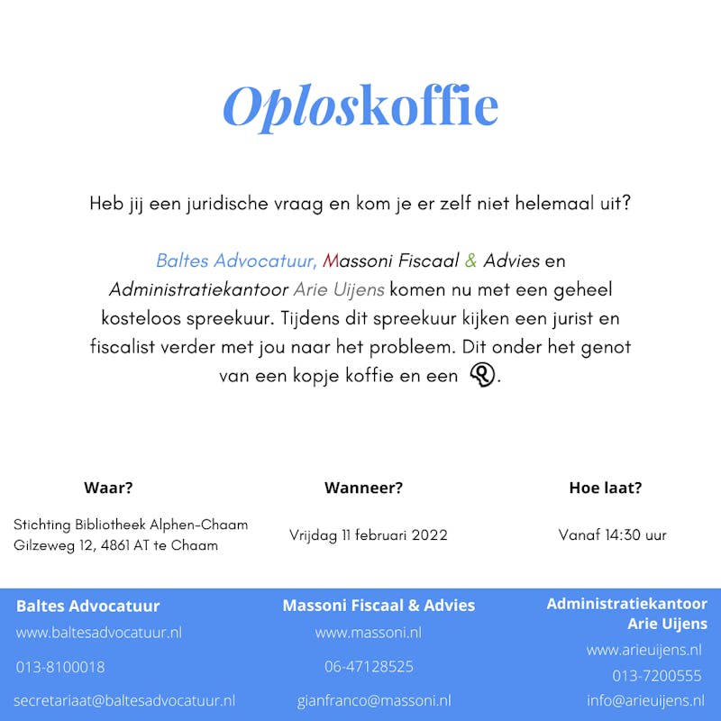 Een jurist en een fiscalist houden een gratis spreekuur in de bibliotheek Alphen-Chaam onder het genot van een kopje koffie.